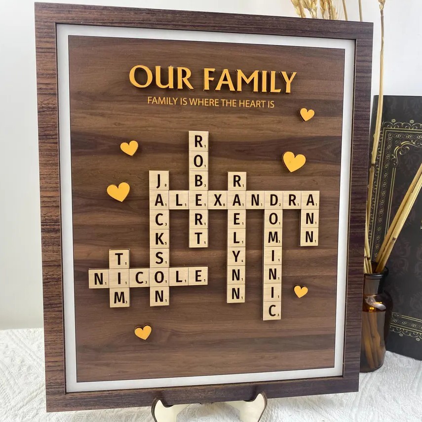 Personalized Family Design: Customizable letter tiles to represent each family member’s name, arranged in a charming crossword style.
